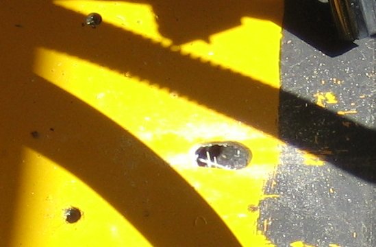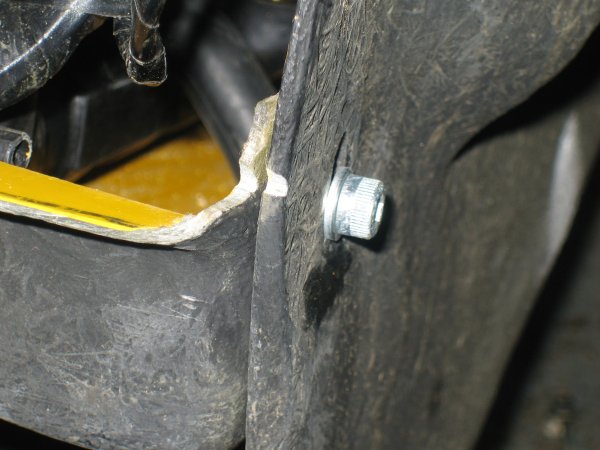 Because of the extreme depth of the new radiator, two small holes are needed to take the bottom corner of each side tank. This will enable the radiator to sit lower, and help seal the gap at the bottom of the radiator. The corners of the tank only just protrude below the ducting. |